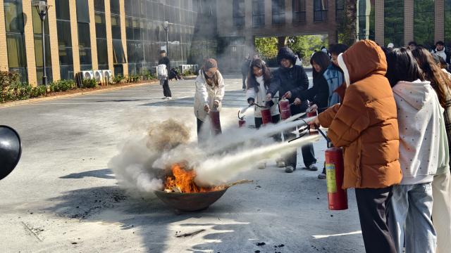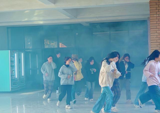 演练警报响起后,师生们立即按照疏散要求,迅速而有序地依照逃生路线进行撤离,动作规范且迅速,谨慎而不慌乱。疏散引导组指挥大家进行安全疏散,确保每一个人都能快速、安全地撤离到指定的集合地点。在艺术楼集合点,各班级迅速整队,清点人数,并及时向演练总指挥报告。安全抵达集合点后,保卫处消防科负责人向师生们详细介绍了逃生呼吸器的佩戴方法、火灾应急疏散逃生要领、干粉灭火器和消防水枪的使用方法等,并进行现场演示。随后,同学们在保卫处消防科负责人指导下,分别对呼吸器的佩戴、干粉灭火器和消防水枪的使用进行实际操作。