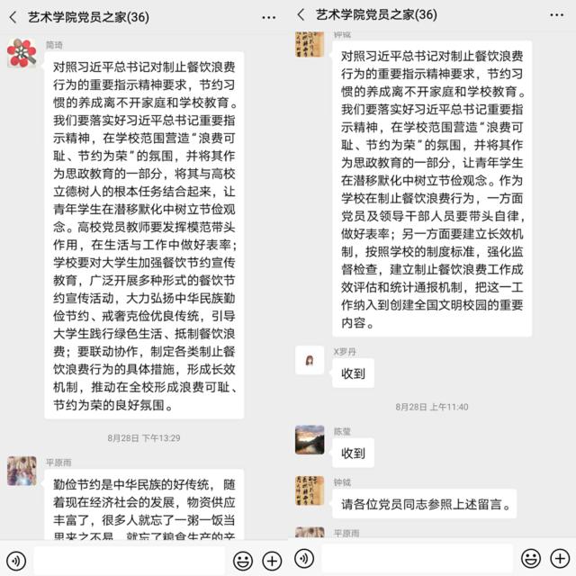 为深入学习指示精神,并确保学习取得实效,公司师生通过线上集中学习和线下个人自学结合起来,学习范围覆盖公司全体教师、教工及员工党支部、班级团支部,广大师生党员通过微信群分享感受,各班级通过召开主题班会,进行倡议承诺。大家纷纷表示,从自身做起、从本职工作做起,坚决杜绝餐桌上的浪费,积极倡导“厉行节约,反对浪费”的社会风尚,投身全社会深入推进制止餐饮浪费工作。