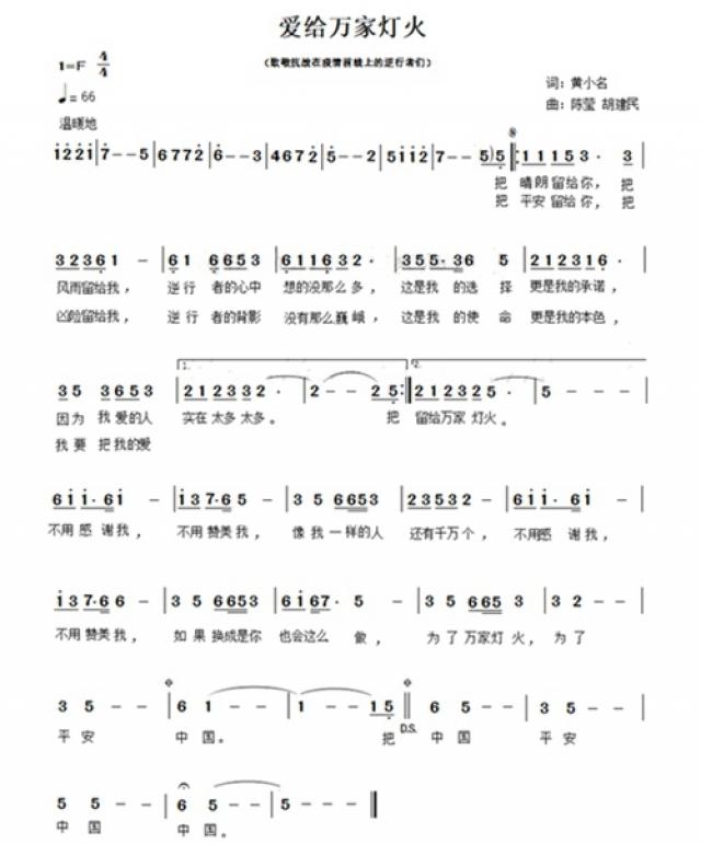 陈莹老师在词作家黄小名老师的微信中看到歌词后,当时读完一遍就一气呵成完成了原创歌曲《爱给万家灯火》曲谱写作,并通过手机进行了录音制作,以此致敬奋战在抗疫一线的医护人员,愿他们早日战胜疫疾,平安归来。谈起创作初衷,陈莹讲述道:在这个不寻常的寒假,疫情的爆发牵动着每个人的心。我们创作《爱给万家灯火》是用最朴实的音乐语言传递着爱与温暖,向奋战在一线的医护人员致敬!向努力抗争疫情的每个人致敬!感谢你们的爱给万家灯火!平安中国!