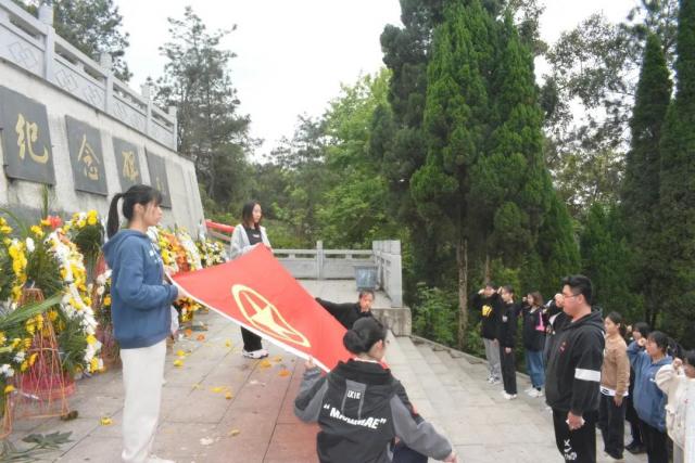 接下来进入重温入团誓词环节,全体团员青年佩戴团徽、在革命英雄纪念碑前举起右手,面向团旗重温入团誓词,在汪鑫同学的带领下进行庄严的入团宣誓。句句誓言,铿锵有力,从在场的所有人内心深处迸发出来。我们深深意识到祭奠是对革命先烈最好的缅怀。