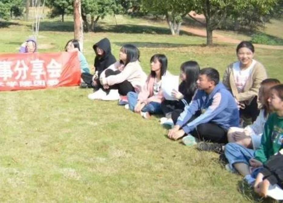 同学们席地而坐,团支书宣布活动开始,大家一起通过无数个英雄事例聆听气壮山河的英歌。