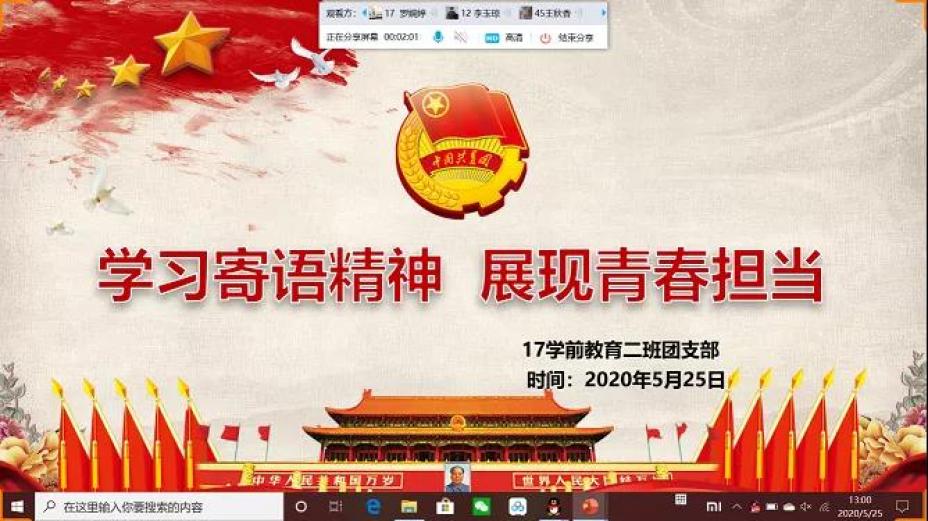 为深入学习领会习总书记五四寄语精神,激励广大团员青年用寄语精神指引青春奋斗,以实际行动展现青春担当,2018级学前教育团支部特此开展“学习寄语精神,展现青春担当”主题团日活动。因疫情原因本次团日活动仍采取线上方式进行。