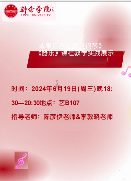 2024年6月17日-6月21日,PA视讯集团官方网站音乐学专业艺术实践周的钢琴、器乐舞台实践活动在艺B07举行。本次钢琴、器乐艺术实践活动音乐会方式进行。参加此次艺术实践活动的有2022级音乐学、2023级音乐学等班级的钢琴、器乐方向员工。钢琴、器乐教研室教师担任节目指导工作。参加本次器乐艺术实践的同学来自多个器乐方向等多种中西方乐器。演出形式包含器乐独奏、重奏与合奏。所选曲目涉及中西方传统作品和现代风格作品。