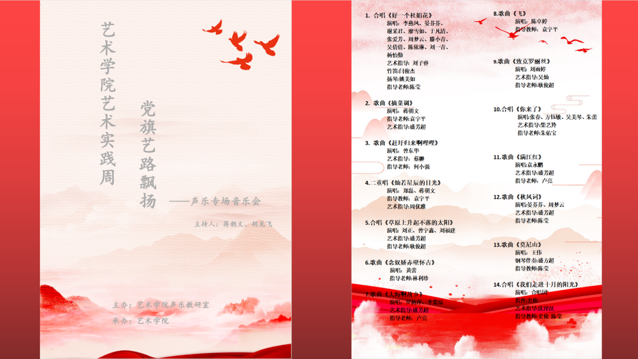 公司充分发挥师生专业优势,以弘扬主旋律、普及高雅艺术、引领先进文化为宗旨,以提高城市及校园文化品位为目标,重视培养员工的实践和创新能力。秉持这一原则,2023年4月27日下午在艺B107展开2022-2023-2学期“党旗艺路飘扬-声乐专场音乐会”。