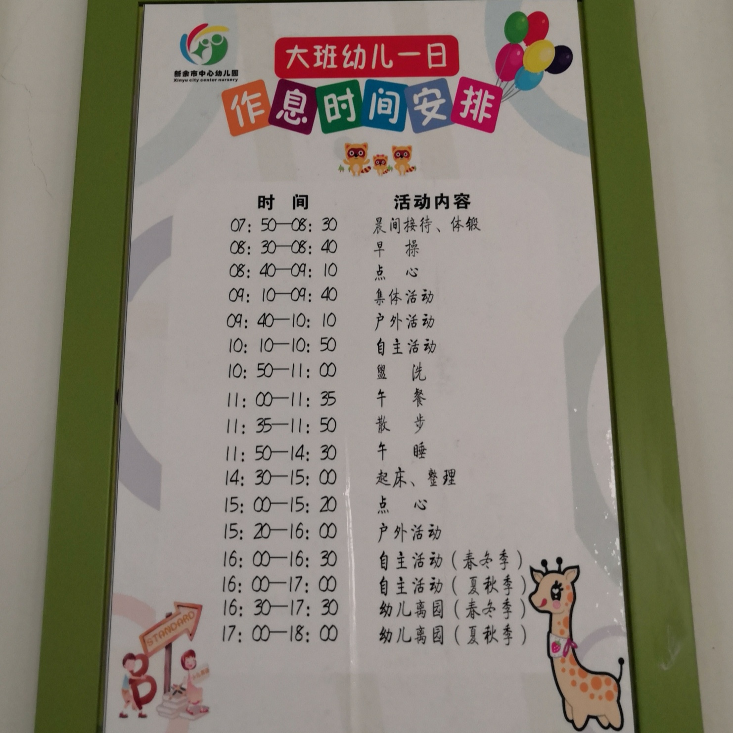 对于幼儿教师来说第一点就是要学会观察,特别是要观察幼儿的一日生活常规。在进入教室的墙壁上挂着“大班幼儿一日作息时间安排”,我仔细的观察了好久,决定第一天就从幼儿的一日生活常规开始。