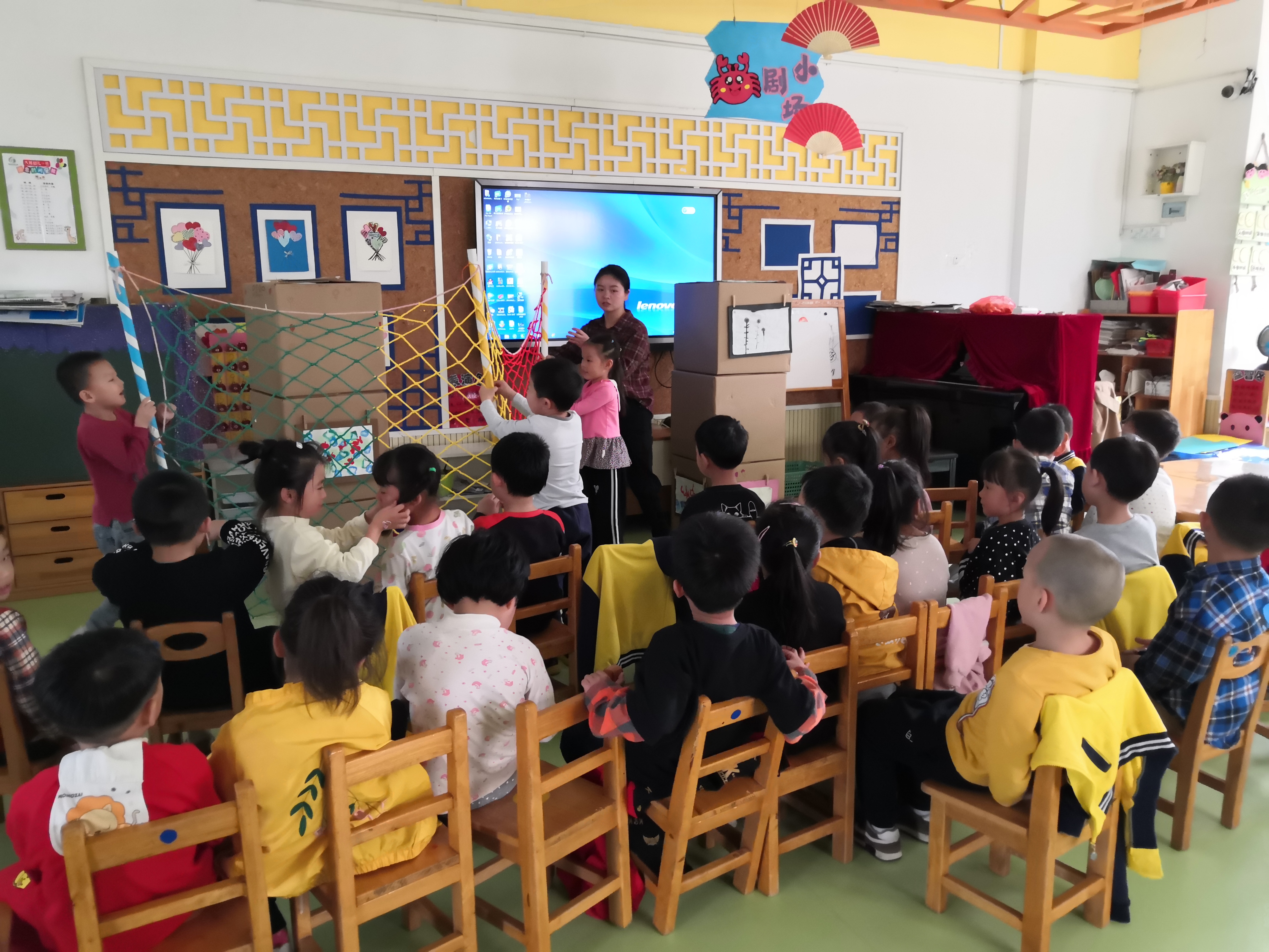 与幼儿园的负责老师联系后我们进入了幼儿园,刚进入幼儿园“快乐、自信、表达、表现”八个大字映入我们眼中,直接将整个幼儿园的核心理念告诉所有人,一切为了孩子。接下来就是将我们每一个人分配到每一个班上去。我很幸运的分到了大二班。