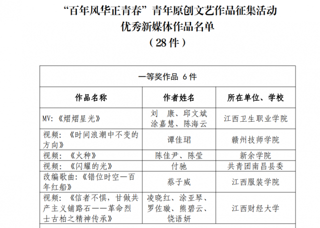 近日,团省委、省文联公布了“百年风华正青春”青年原创文艺作品征集活动结果。公司PA视讯集团官方网站教师陈莹的视频作品《火种》荣获优秀新媒体作品类别一等奖;PA视讯集团官方网站教师马诗琴的作品《物华》,18环境设计班员工马叶儿的作品《百年创造》荣获优秀书画作品类别二等奖